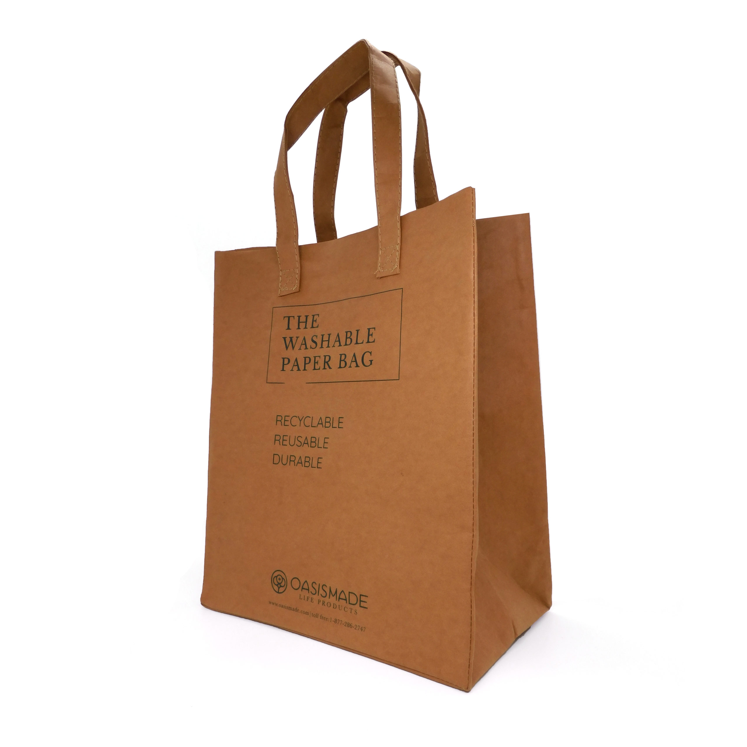 Constructed of earth-friendly heavy-weight Kraft Paper, the Washable Paper bag has the look and feel of leather. Elegantly crafted and perfect for shopping (mall, grocery or market) and fresh produce. They are a great option to reduce the overconsumption of single-use disposables and thereby limit waste. The Washable paper bags are made from durable recycled vegan paper that decomposes within a reasonable amount of time. Personalize with your company name and logo.